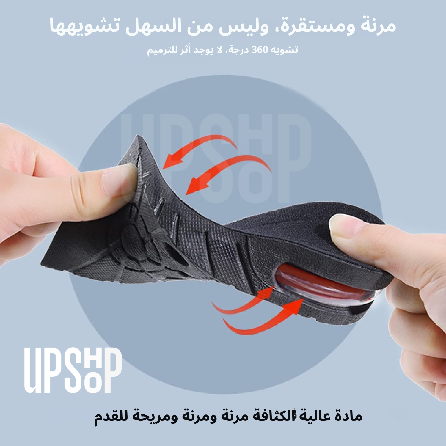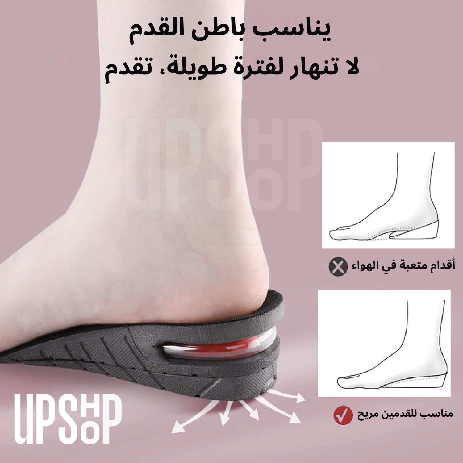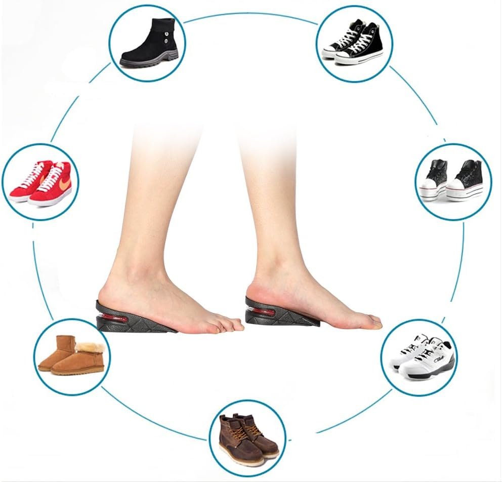 نعل داخلي للارتفاع: نعل داخلي لزيادة الارتفاع قابل للتعديل من 1.2 بوصة إلى 3.5 بوصة حسب نوع الحذاء. مقاس قابل للتعديل من 4US إلى 9US. يمكن قصه ليناسب مقاس أو نوع حذائك المحدد.