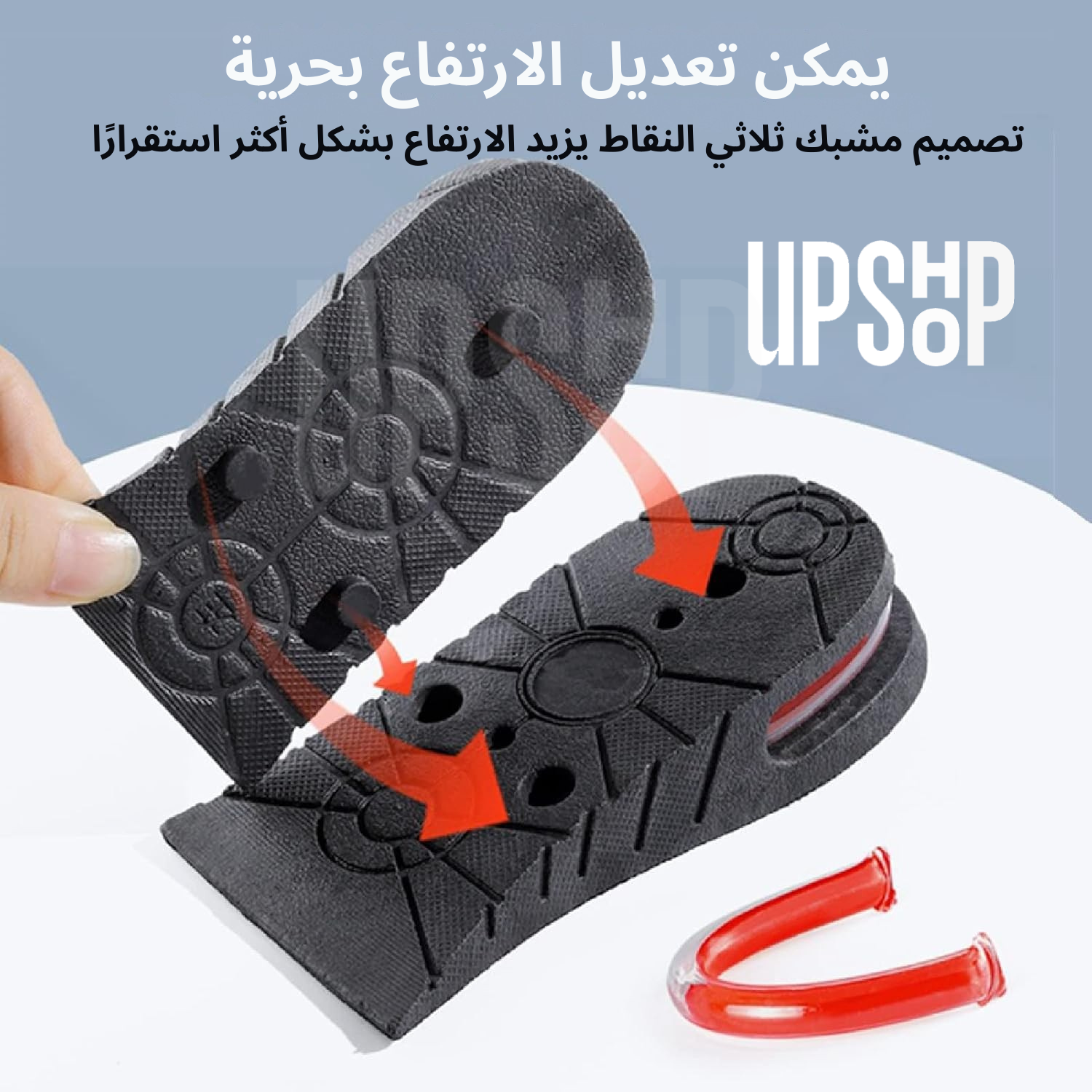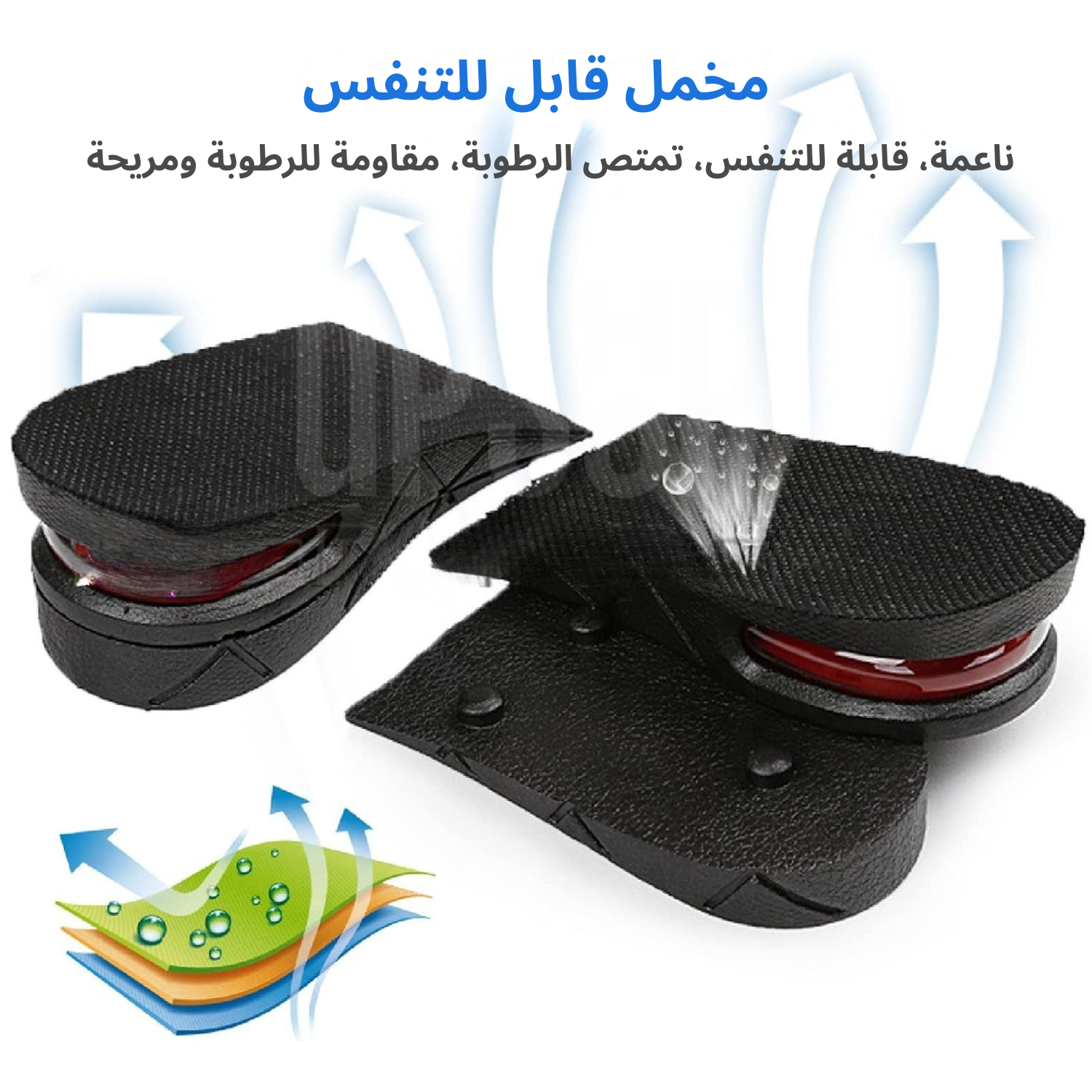نعل داخلي لزيادة الارتفاع: طبقات من النعل الداخلي بارتفاع قابل للتعديل، لزيادة طول الساق أو تصحيح الفرق في طول الساقين اليسرى واليمنى.